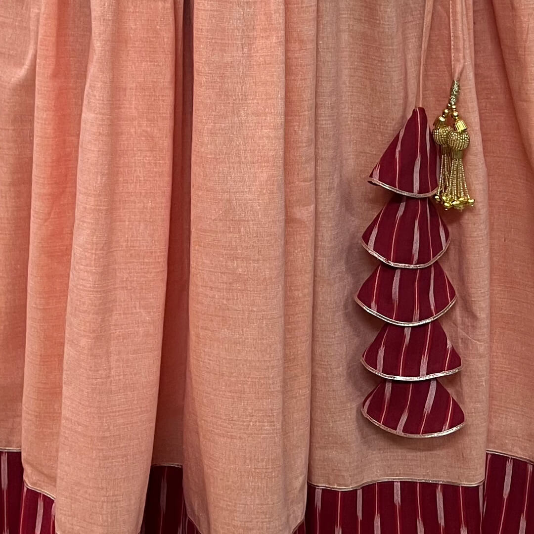 This amazing ghaghra skirt made with 6 metres of fine cotton with Ikkat border and gota lace is perfect just the way you wear it. For casual look team it up with crop top and flat sandles or a smart blouse and fun jewellery for formal occasion.